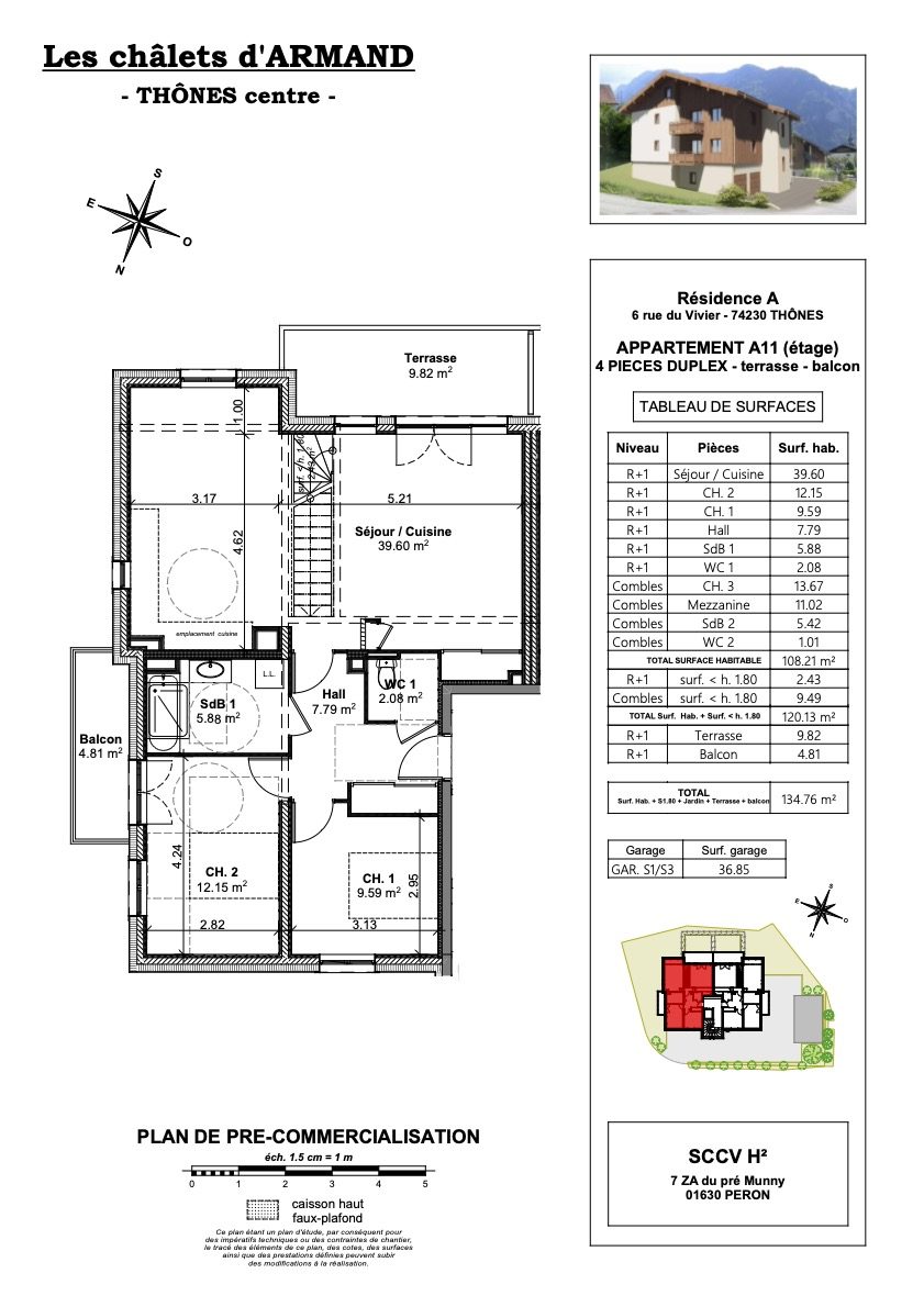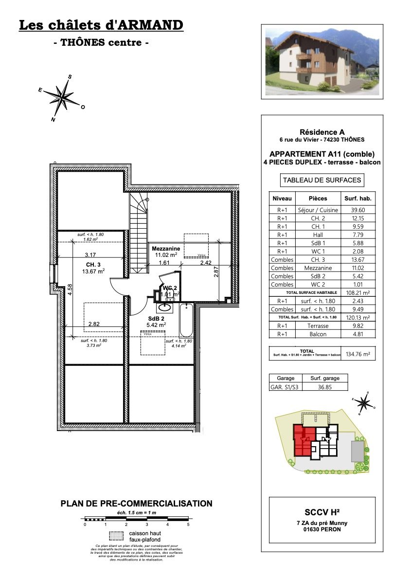 Situé dans un quartier privilégié de Thônes, dans le nouveau programme LES CHALETS D’ARMAND, à 20km d’Annecy et 15 min des stations des Aravis et proche de toutes commodités à pied, découvrez cet appartement T4 Duplex situé au dernier étage d’une surface habitable de 119.04 m² dont 108.21 m² Loi Carrez, dans une mini-résidence avec ascenseur sans vis à vis.Il propose une entrée, une salle de bain avec baignoire ou douche, un WC séparé, 2 chambres dont une donnant accès au balcon de 4.81 m² orienté Est et une autre avec un placard, une cuisine ouverte sur séjour (soit 39.60 m² de pièce de vie). La pièce de vie donne accès à une terrasse de 9.82 m² orienté Sud.A l’étage il propose, une mezzanine, une chambre, une salle de bain et un WC séparé.Côté annexes, vous profiterez d’un local à vélos collectif. Possibilité d’acquérir un garage.Future construction avec de belles prestations : parquet ou carrelage dans toutes les pièces avec personnalisation de tous vos sols et la couleur de vos faïences de cuisine et salle de bains, visiophone pour un accès sécurisé, menuiserie double-vitrage isolant, système de chauffage par pompe à chaleur… Future copropriété de 9 logements (répartis en 2 mini-résidences) – livraison 4ème trimestre 2024/ 1er trimestre 2025. Hors DPE. Bilan de Performance Énergétique (BPE) du projet : A.Renseignements en agence, par mail ou par téléphone. D’autres T4 Duplex sont également disponibles ! Frais de notaire réduits. Honoraires à la charge du vendeur.