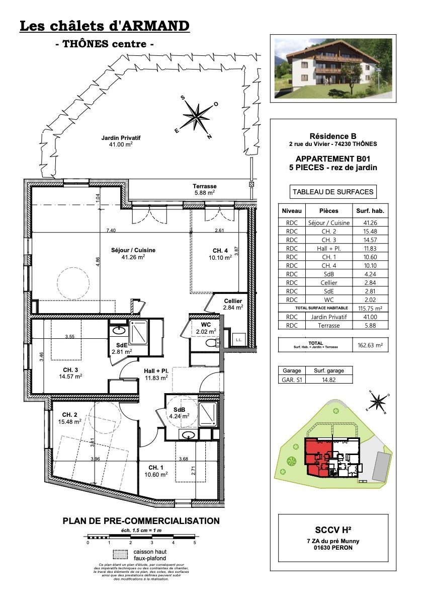 Situé dans un quartier privilégié de Thônes, dans le nouveau programme LES CHALETS D’ARMAND, à 20km d’Annecy et 15 min des stations des Aravis et proche de toutes commodités à pied, découvrez cet appartement T5 situé au rez-de-jardin d’une surface habitable de 115.82 m² dans une mini-résidence avec ascenseur sans vis à vis.Il propose une entrée avec placard, une salle d’eau, un WC séparé, 4 chambres dont une possédant une salle d’eau et un placard et une autre avec un accès à la terrasse, un cellier, une cuisine ouverte sur séjour (soit 41.26 m² de pièce de vie). La pièce de vie donne accès à une terrasse de 5.88 m² ainsi qu’à un jardin privatif de 41 m² orienté Sud.Côté annexes, vous profiterez d’un local à vélos collectif. Possibilité d’acquérir un garageFuture construction avec de belles prestations : parquet ou carrelage dans toutes les pièces avec personnalisation de tous vos sols et la couleur de vos faïences de cuisine et salle de bains, visiophone pour un accès sécurisé, menuiserie double-vitrage isolant, système de chauffage par pompe à chaleur… Future copropriété de 9 logements (répartis en 2 mini-résidences) – livraison 4ème trimestre 2024/ 1er trimestre 2025. Hors DPE. Bilan de Performance Énergétique (BPE) du projet : A.Renseignements en agence, par mail ou par téléphone. D’autres T5 sont également disponibles ! Frais de notaire réduits. Honoraires à la charge du vendeur.