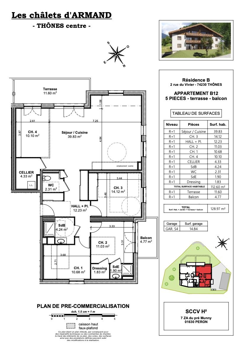 Situé dans un quartier privilégié de Thônes, dans le nouveau programme LES CHALETS D’ARMAND, à 20km d’Annecy et 15 min des stations des Aravis et proche de toutes commodités à pied, découvrez cet appartement T5 situé au rez-de-jardin d’une surface habitable de 112.60 m² dans une mini-résidence avec ascenseur sans vis à vis.Il propose une entrée avec placard, une salle d’eau, un WC séparé, 4 chambres dont une avec salle d’eau et un balcon de 4.77 m² orienté Ouest, un cellier, une cuisine ouverte sur séjour (soit 39.83 m² de pièce de vie). La pièce de vie donne accès à une terrasse de 11.60 m² orienté Sud.Côté annexes, vous profiterez d’un local à vélos collectif. Possibilité d’acquérir un garageFuture construction avec de belles prestations : parquet ou carrelage dans toutes les pièces avec personnalisation de tous vos sols et la couleur de vos faïences de cuisine et salle de bains, visiophone pour un accès sécurisé, menuiserie double-vitrage isolant, système de chauffage par pompe à chaleur… Future copropriété de 9 logements (répartis en 2 mini-résidences) – livraison 4ème trimestre 2024/ 1er trimestre 2025. Hors DPE. Bilan de Performance Énergétique (BPE) du projet : A.Renseignements en agence, par mail ou par téléphone. D’autres T5 sont également disponibles ! Frais de notaire réduits. Honoraires à la charge du vendeur.