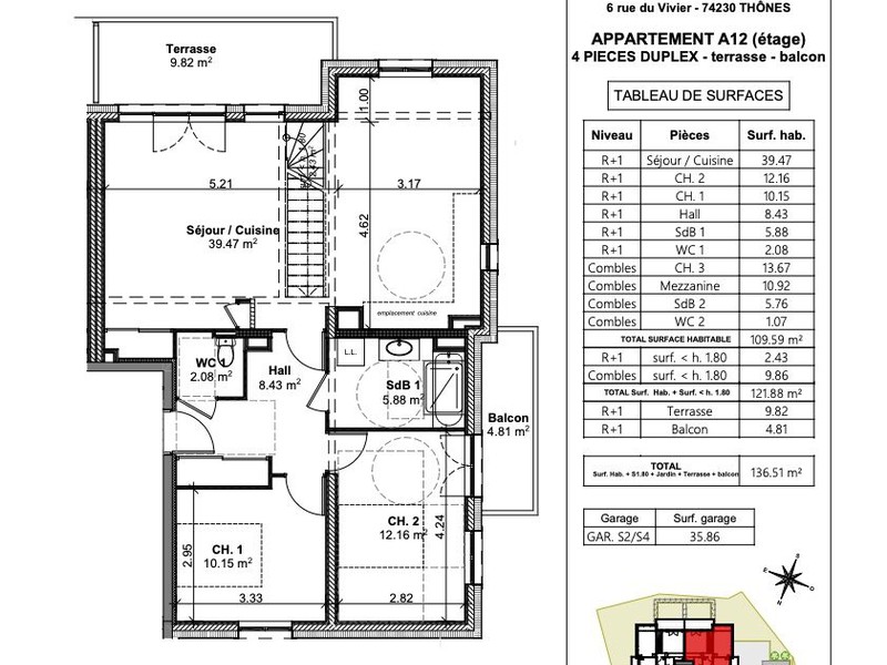 Situé dans un quartier privilégié de Thônes, dans le nouveau programme LES CHALETS D'ARMAND, à 20km d'Annecy et 15 min des stations des Aravis et proche de toutes commodités à pied, découvrez cet appartement T4 Duplex situé au dernier étage d'une surface habitable de 122.32 m² dont 109.59 m² Loi Carrez, dans une mini-résidence avec ascenseur sans vis à vis. Il propose une entrée, une salle de bain avec baignoire ou douche, un WC séparé, 2 chambres dont une donnant accès au balcon de 4.81 m² orienté Ouest et une autre avec un placard, une cuisine ouverte sur séjour (soit 39.47 m² de pièce de vie). La pièce de vie donne accès à une terrasse de 9.82 m² orienté Sud. A l'étage il propose, une mezzanine, une chambre, une salle de bain et un WC séparé. Côté annexes, vous profiterez d'un local à vélos collectif. Possibilité d'acquérir un garage. Future construction avec de belles prestations : parquet ou carrelage dans toutes les pièces avec personnalisation de tous vos sols et la couleur de vos faïences de cuisine et salle de bains, visiophone pour un accès sécurisé, menuiserie double-vitrage isolant, système de chauffage par pompe à chaleur… Future copropriété de 9 logements (répartis en 2 mini-résidences) - livraison 3ème trimestre 2027. Bilan de Performance Énergétique (BPE) du projet : A. Renseignements en agence, par mail ou par téléphone. Frais de notaire réduits. Honoraires à la charge du vendeur. Dans une copropriété de 9 lots. Aucune procédure n'est en cours. DPE vierge. Les informations sur les risques auxquels ce bien est exposé sont disponibles sur le site Géorisques : georisques.gouv.fr.