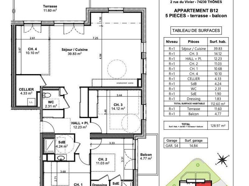 Situé dans un quartier privilégié de Thônes, dans le nouveau programme LES CHALETS D'ARMAND, à 20km d'Annecy et 15 min des stations des Aravis et proche de toutes commodités à pied, découvrez cet appartement T5 situé au rez-de-jardin d'une surface habitable de 112.60 m² dans une mini-résidence avec ascenseur sans vis à vis. Il propose une entrée avec placard, une salle d'eau, un WC séparé, 4 chambres dont une avec salle d'eau et un balcon de 4.77 m² orienté Ouest, un cellier, une cuisine ouverte sur séjour (soit 39.83 m² de pièce de vie). La pièce de vie donne accès à une terrasse de 11.60 m² orienté Sud. Côté annexes, vous profiterez d'un local à vélos collectif. Possibilité d'acquérir un garage. Future construction avec de belles prestations : parquet ou carrelage dans toutes les pièces avec personnalisation de tous vos sols et la couleur de vos faïences de cuisine et salle de bains, visiophone pour un accès sécurisé, menuiserie double-vitrage isolant, système de chauffage par pompe à chaleur… Future copropriété de 9 logements (répartis en 2 mini-résidences) - livraison 3ème trimestre 2027. Bilan de Performance Énergétique (BPE) du projet : A. Renseignements en agence, par mail ou par téléphone. Frais de notaire réduits. Honoraires à la charge du vendeur. Dans une copropriété de 9 lots. Aucune procédure n'est en cours. DPE vierge. Les informations sur les risques auxquels ce bien est exposé sont disponibles sur le site Géorisques : georisques.gouv.fr.