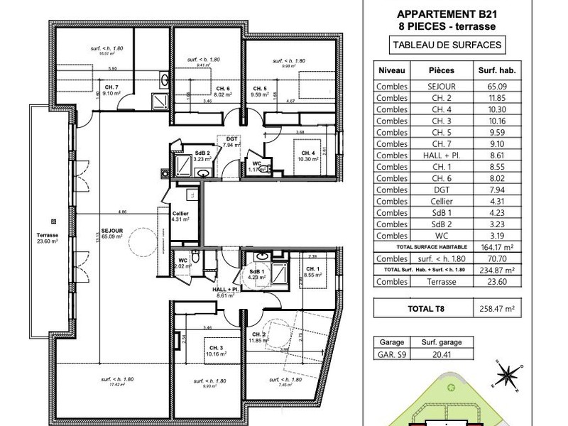 Il propose une entrée, 3 salles d'eau, 2 WC séparé, 7 chambres, un cellier, une cuisine ouverte sur séjour (soit 65.09 m² de pièce de vie).