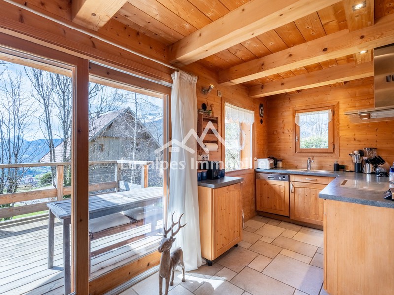 Ce chalet saura vous séduire par son spacieux séjour/salle à manger équipé d'un poêle, sa terrasse orientée plein sud, et sa cuisine semi-ouverte entièrement équipée avec un cellier.