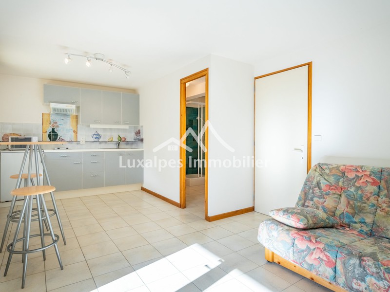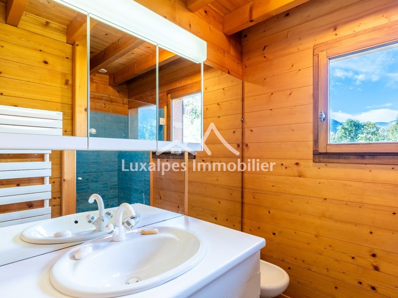 Ce chalet se compose, au rez-de-chaussée, d'une entrée, vaste pièce de vie avec insert en grès, salon avec accès terrasse exposée Sud-Ouest et salle à manger, coin cuisine menant à la terrasse et au jardin ombragé, une chambre avec placard intégré, une salle d'eau et WC séparé avec lave-mains. Au 1er étage, un bureau et une grande chambre avec accès balcon et rangements.