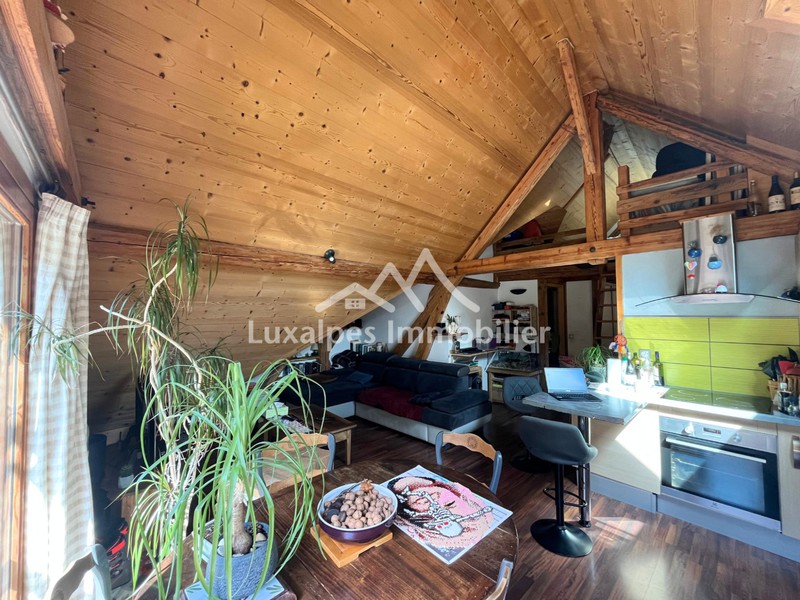 L'appartement de presque 86 m² au sol, dont 52,10 m² de superficie Loi Carrez propose une entrée avec rangements, 2 chambres avec placards, une salle d'eau avec WC, un bel et lumineux espace de vie style chalet avec cuisine ouverte sur la salle à manger et le salon et une mezzanine avec coin nuit.